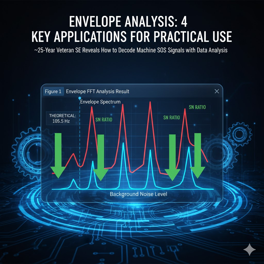 - エンベロープ解析(リズム分析): 周囲がどれだけ騒がしくても、ドラムが「ドン、ドン」と叩かれる間隔だけに注目します。この「叩く間隔」がわかれば、ベアリングのどの部品に傷があるかを特定できます。