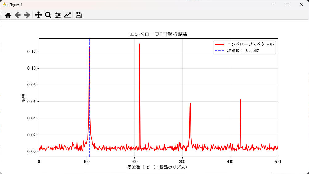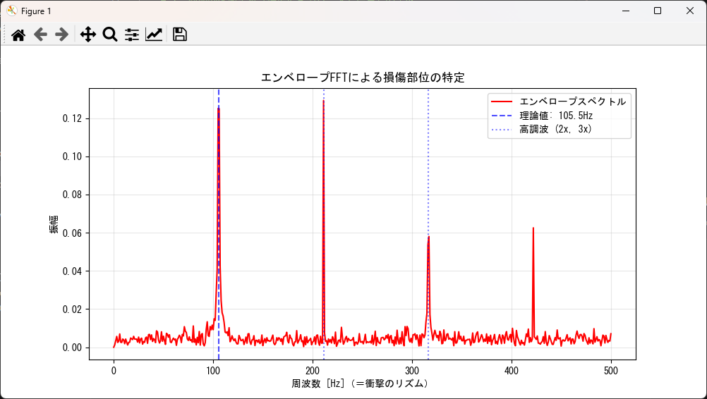 次に、その帯域(例:2kHz〜4.5kHz)でプログラムを走らせ、エンベロープスペクトルを描画します。 - グラフを見て「改善」しているか判定する