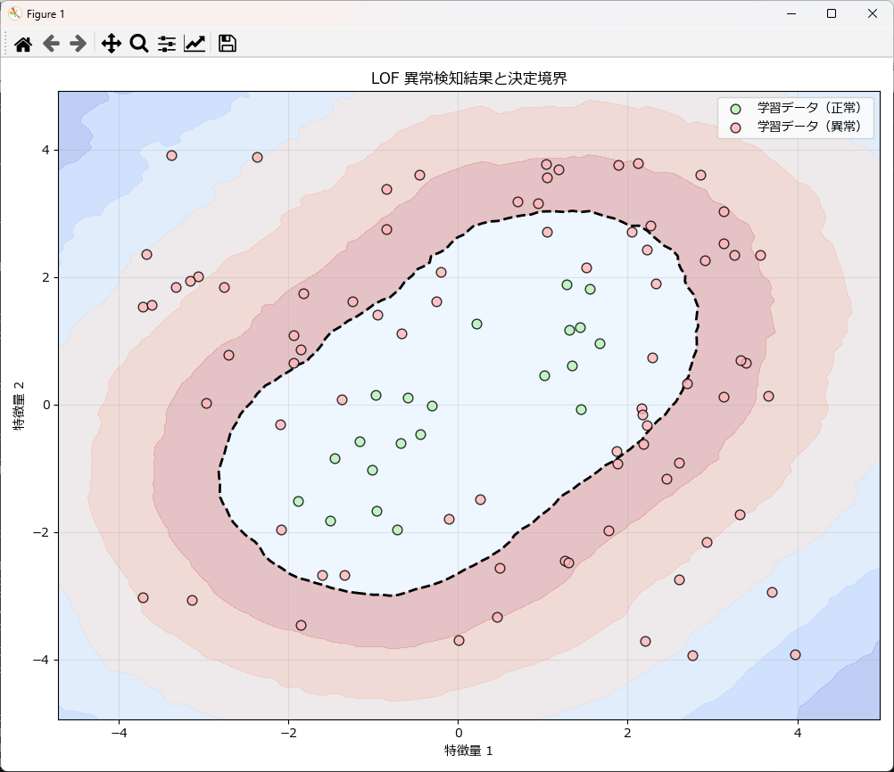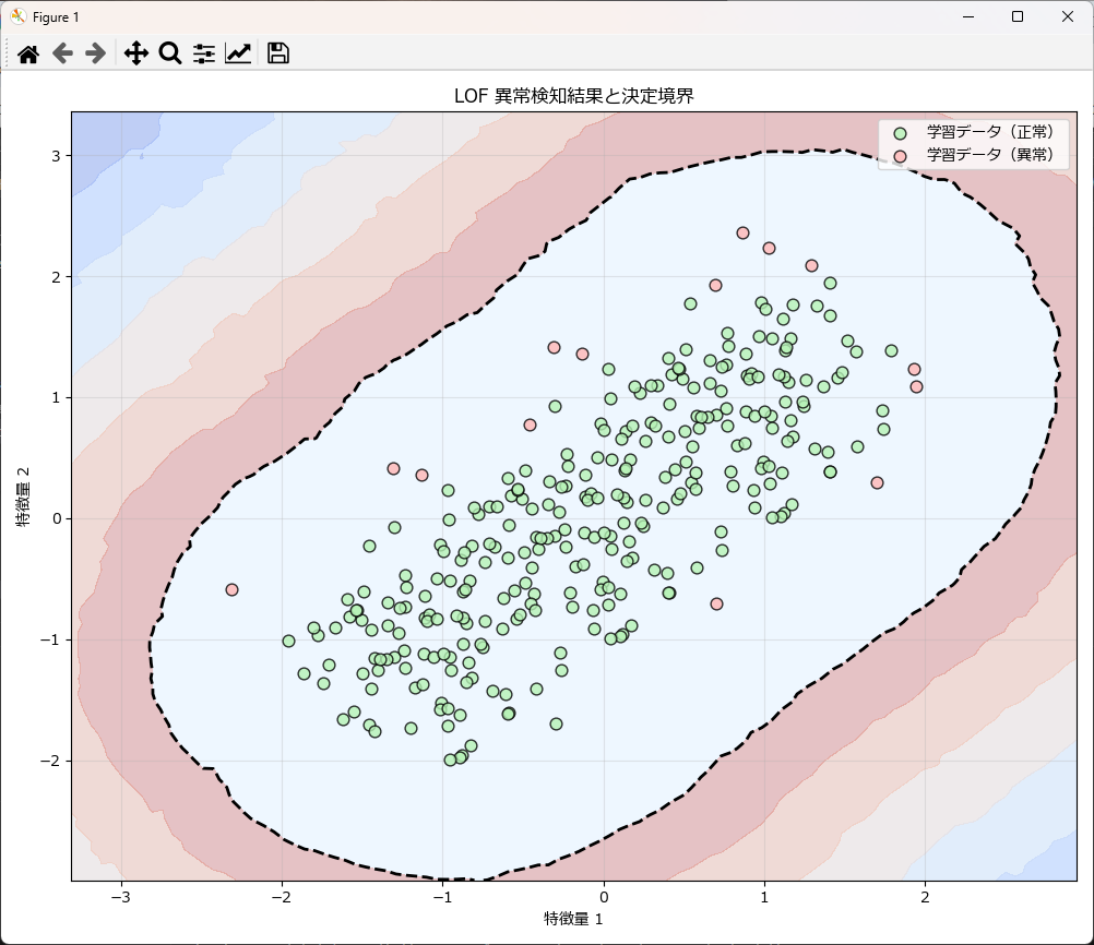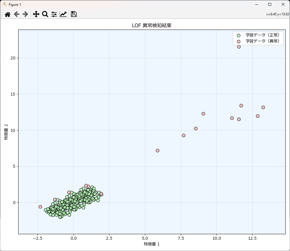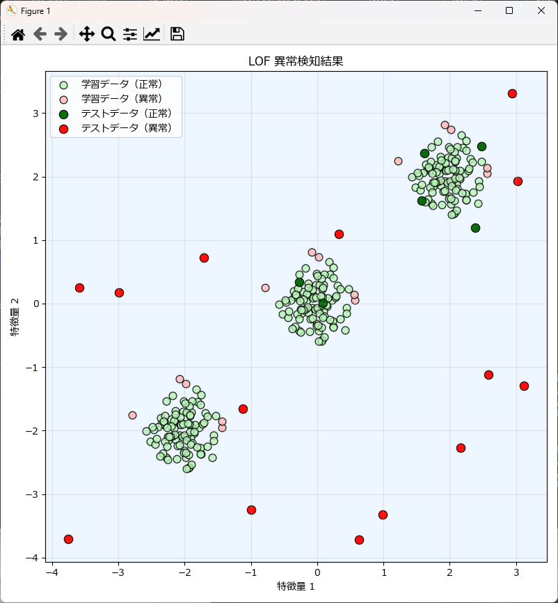 学習データを投入した場合には、ほとんどの点が正常と判定されますが、クラスタの境界付近や局所的に密度が低い点については異常とみなされることがあります。これは、LOFが周囲の点との密度差を基準にしているため、完全に正常なデータであっても「周囲より浮いている」と判断されるケースがあるからです。
