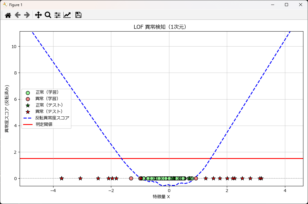 LOFの実行結果では、正常なデータは 1、異常なデータは -1 として判定されます。