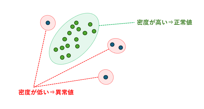 LOFは各データポイントの周囲に存在する近傍点との距離を評価し、その点がどれだけ周囲と比べて孤立しているかを数値化します。局所的な密度が周囲より低い点は「浮いている」と判断され、外れ値として検出されます。